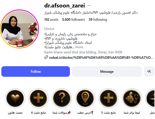 دکتر افسون زارعی متخصص زنان، زایمان و نازایی، فلوشیپ فوق تخصصی نازایی و IVF،جراح لاپاراسکوپی و هیستروسکوپی از دانشگاه مکگیل کانادا و دانشیار دانشگاه علوم پزشکی شیراز هستند که در شیراز فعالیت میکنند و در زمینه درمان ناباروری، اندومتریوز، فیبروم، جراحیهای زنان تخصص دارند.