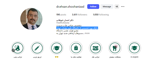 دکتر احسان شوهانیزاد یکی از جراحان فک و صورت با تخصص در درمان ناهنجاریهای فکی و جراحیهای صورت هستند.دارای بورد تخصصی از دانشگاه علوم پزشکی تهران در رزومه ایشان به چشم می خورد.